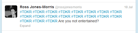 Well I say ‘frothing at the mouth’ but of course in the 21st century one does not literally froth at the mouth. No, that’s much too vulgar. What instead we got was people spewing #TDKR #TDKR #TDKR #TDKR #TDKR #TDKR #TDKR #TDKR #TDKR #TDKR #TDKR and the occasional #TKDR OMG like hashtags were about to be outlawed and self-censorship was actually outlawed. Twitter was a terrible place to be last weekend, especially if you were one of the few people on earth not to have seen the film already (and I saw it on Friday night). There were the rabidly supportive and the slightly indifferent. Oh, and the very rabidly supportive. That was it.