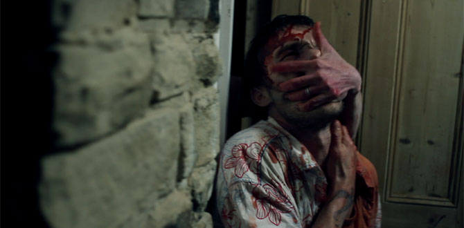 Starting with what looks like the set up for a Northern kitchen sink drama, we meet Alex (director Dominic Brunt) and his wife Meg (Joanne Mitchell). This couple has been drifting apart through Alex’s unemployment and Meg’s workaholic behaviour. The opening scene tells us all we need to know about their relationship and the two of them leave their two children with Meg’s mother and go away to a remote house in the countryside in a last-ditch attempt to save their marriage. When they get to the house, Alex’s attempts to rekindle the romance with Meg don’t go well and end in a drunken binge. Meg goes running the next morning and is chased by a blood dribbling, angry and running freak. She barely makes it back to the house and the two of them learn that the end of times is happening outside and they are cut off from the rest of the world. One of them gets bitten, a stranger turns up and they can’t get in touch with their family back home.