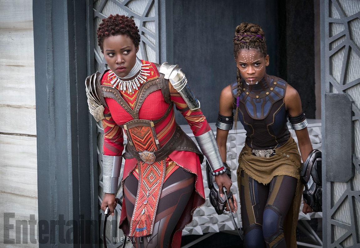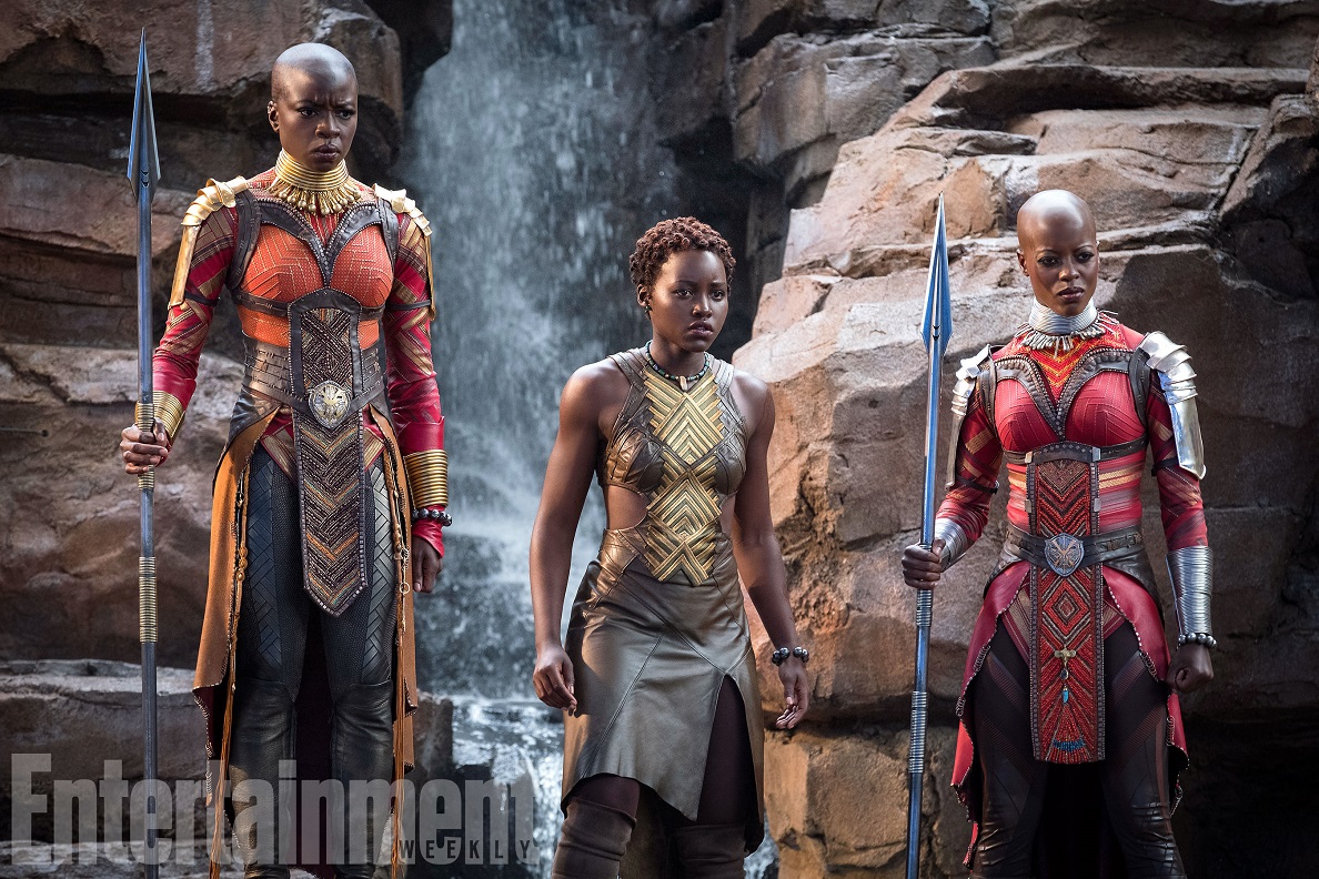 Most of the images depict a stunning cast in equally sensational costume traditional to the home of T’Challa, Wakanda, as well as posed images ripe enough for any marketing material that will reveal itself in the future. We get to witness images of Chadwick Boseman’s T’Challa going into battle with Michael B. Jordan’s scantily clad villain Killmonger. Lupita Nyong’o, who serves as an undercover operative and The Dora Milaje, which is a combination of Special Forces and Secret Service, and all female — led by Okoye (The Walking Dead’s Danai Gurira, left), Ayo (Florence Kasumba), the king’s personal are also looking fierce in their regal battle armour.