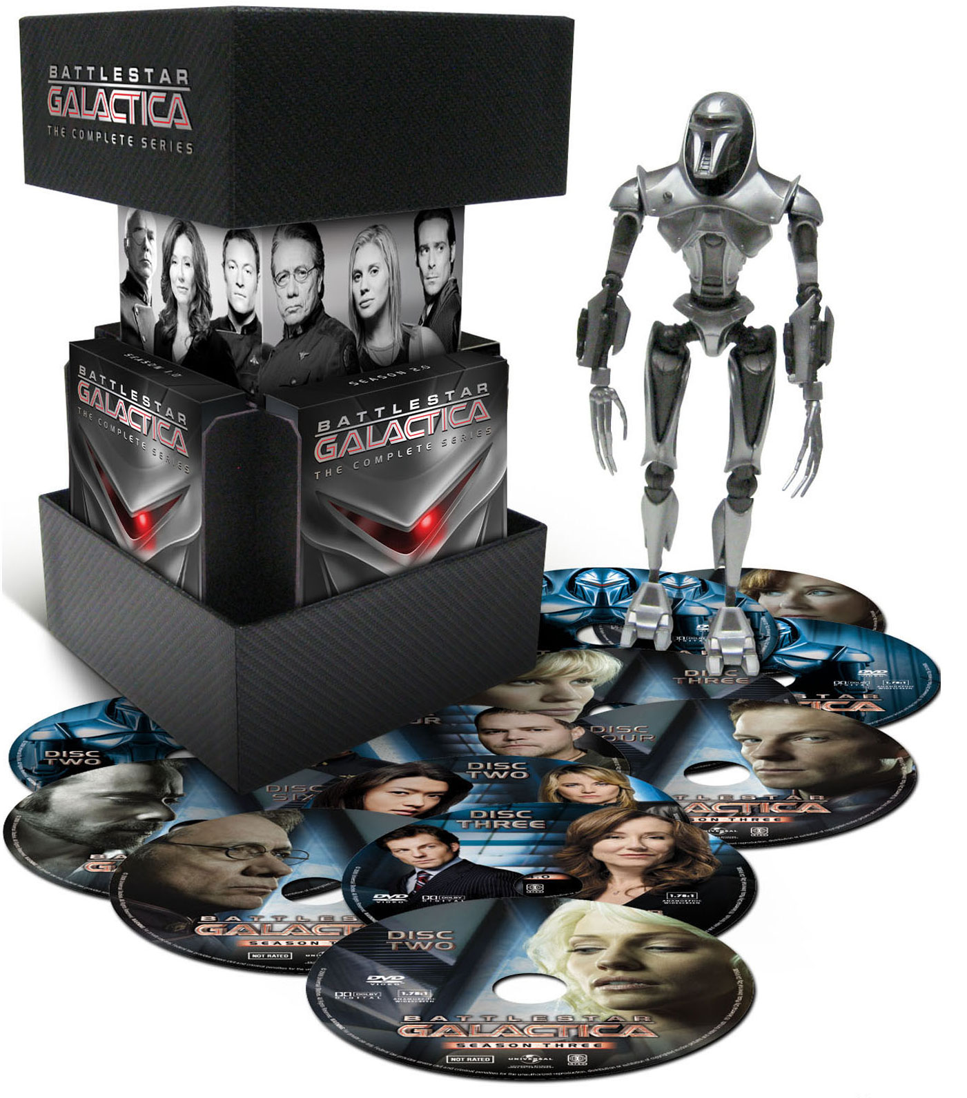 The packaging of the box set is bulky and not really necessary. Each season is packaged in it’s own flip top box and all 4 season boxes are contained in a rather large un-storable 4 sided box. But, it also comes with a handy dandy Cylon action figure! I got rid of the large box, because I just don’t have the space to store it, but the Cylon has his place and sits right above my TV.