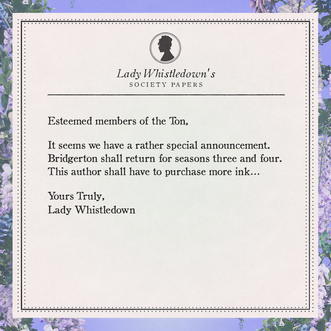Here is Lady Whistledown’s fancy announcement of the upcoming seasons.