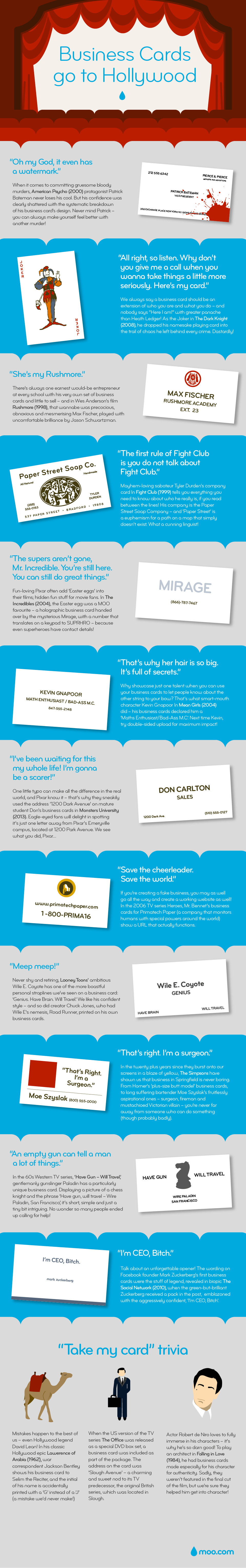 We’ve been using Moo.com since the site started for all our business card needs and now our friends their have created this rather fabulous infographic to tie in nicely with the Oscars this Sunday called ‘Business Cards Go to Hollywood’ taking a little wander down memory lane to revisit some of the most iconic and famous business cards seen in movies.