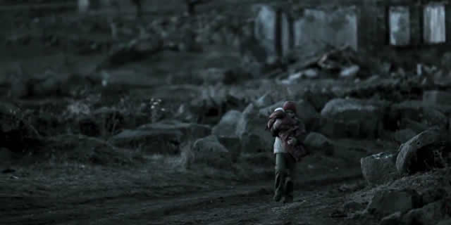 Hazanavicius’ DoP has gone for a classic grainy look with everything sucked of colour, the hues all greys. Many of the scenes were filmed in genuine bombed-out buildings and actual homes. This gives the film a certain realistic feel, though the washed-out colours begin to pall pretty early on. The scenes of the Chechens’ mass exodus from their homes is captured well, and there are moments of humour when the village women are huddled in a room listening to their homes being bombarded. When the only man complains, an elderly woman asks “Should we be serious in death? Does it change anything?”