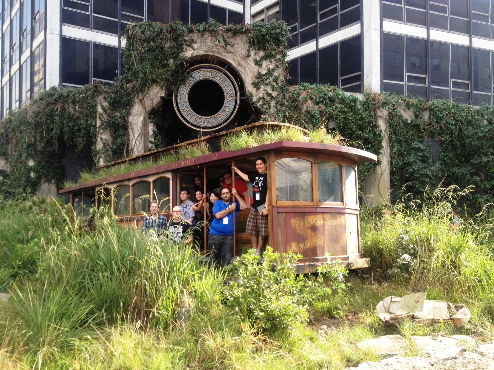 The NOLA financial district is subbing in for the San Francisco Waterfront, some 2,000 miles away. If it weren’t for the camera cranes and a large blue screen above the skyline you wouldn’t have a clue when or where you were. The set is massive in scale and the attention to detail is breathtaking. Grass and vines have grown over where cement streets and plaster walls once occupied. San Francisco remains but she is but a shell of her former self. From my vantage point atop a rusty San Francisco cable car, you can’t quite make out where the Hollywood set ends and the actual city begins.
