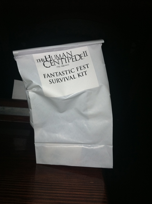 The next item up on the agenda, was to make everybody aware of the Human Centipede Survival Kit which stood on the table before them. This kit consisted of but a staple remover inside a barf bag, and I immediately hoped I would not be needing the use of either. Then, after all the silly gags had been put to rest, it was time for a brief Fantastic Fest bumper (consisting of video from an actual vasectomy procedure), and then the main event.