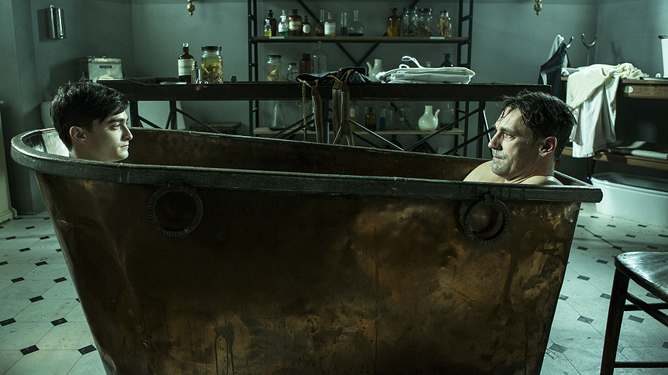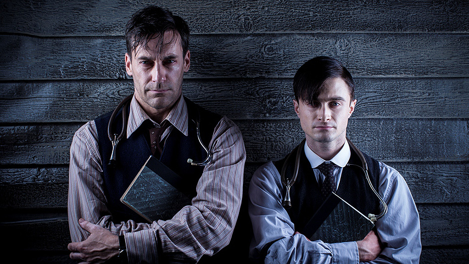 Jon Hamm takes on the role of the older doctor, who has a series of bleakly comic exchanges with his younger self, played by Daniel Radcliffe.”