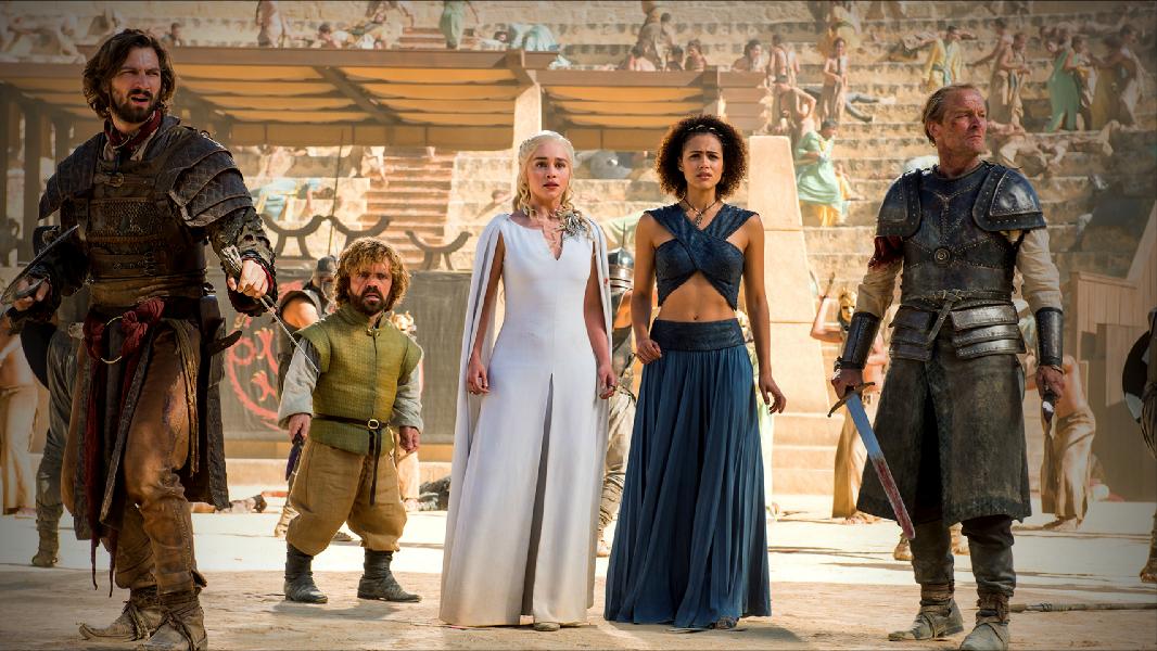 Dany reluctantly sits alongside her council – now featuring her most prized ally Tyrion – at the Fighting Pits of Meereen as ‘The Great Games’ get underway. Warriors embark on the sand and pledge their allegiance and life to Khalessi much to her displeasure before awaiting her approval for their bout.