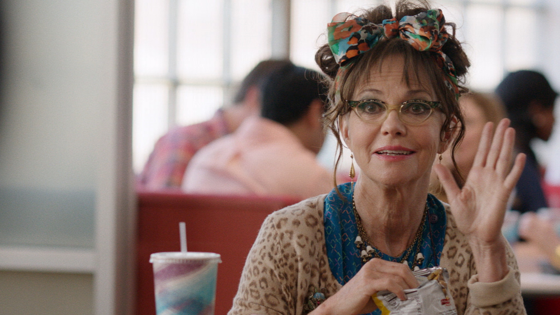 She evokes incredible compassion in scenes depicting her character’s compulsive behaviour and chronic loneliness, but is always prepared to undercut the drama with a punchline or pratfall. At one point she gamely mounts John at an EDM concert only to be spotted by the band and asked to pose for their next album cover, and Field somehow manages to do so with the utmost grace and dignity — while dressed in neon and using a gramophone as a prop.