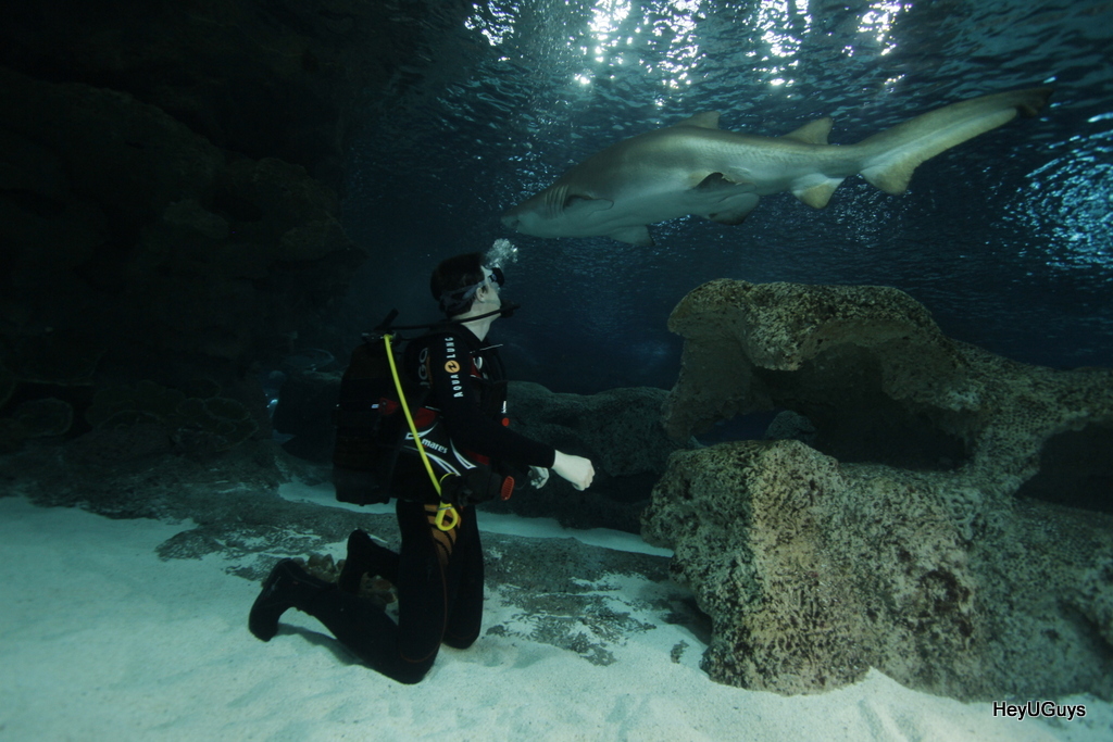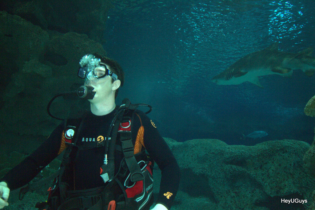 Simply put, it was an amazing experience being immersed and surrounded by these magnificent creatures. In the giant tank was a collection of 10ft sand tiger sharks and lemon sharks who were all very curious to see exactly who we were when we entered the tank. Enjoy the video below which I’ve put together to show exactly what we got up to and some photos of the experience are below. Thanks again to the Blue Planet Aquarium and to Universal for arranging this amazing trip. If you want to visit the aquarium and do your own dive, click here.