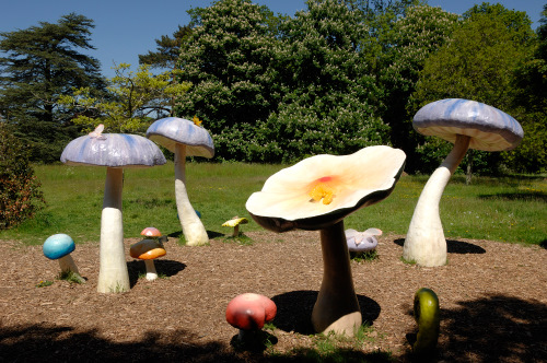 experience which would maintain the spirit of Carroll’s fantasy. On our walk we stumbled across several surprises secreted in the grounds – a forest of toadstools clustered around a Rabbit Hole slide, a riddling, writhing, Cheshire Cat hidden in the depths of a conical Yew and a clock with a familiar face at its heart that kept perfect Underworld time! In the house, too, the presence of the story was tangible and the tiny bedroom Burton (impractically) chose to be Alice’s own seemed quite poised to expect her return.
