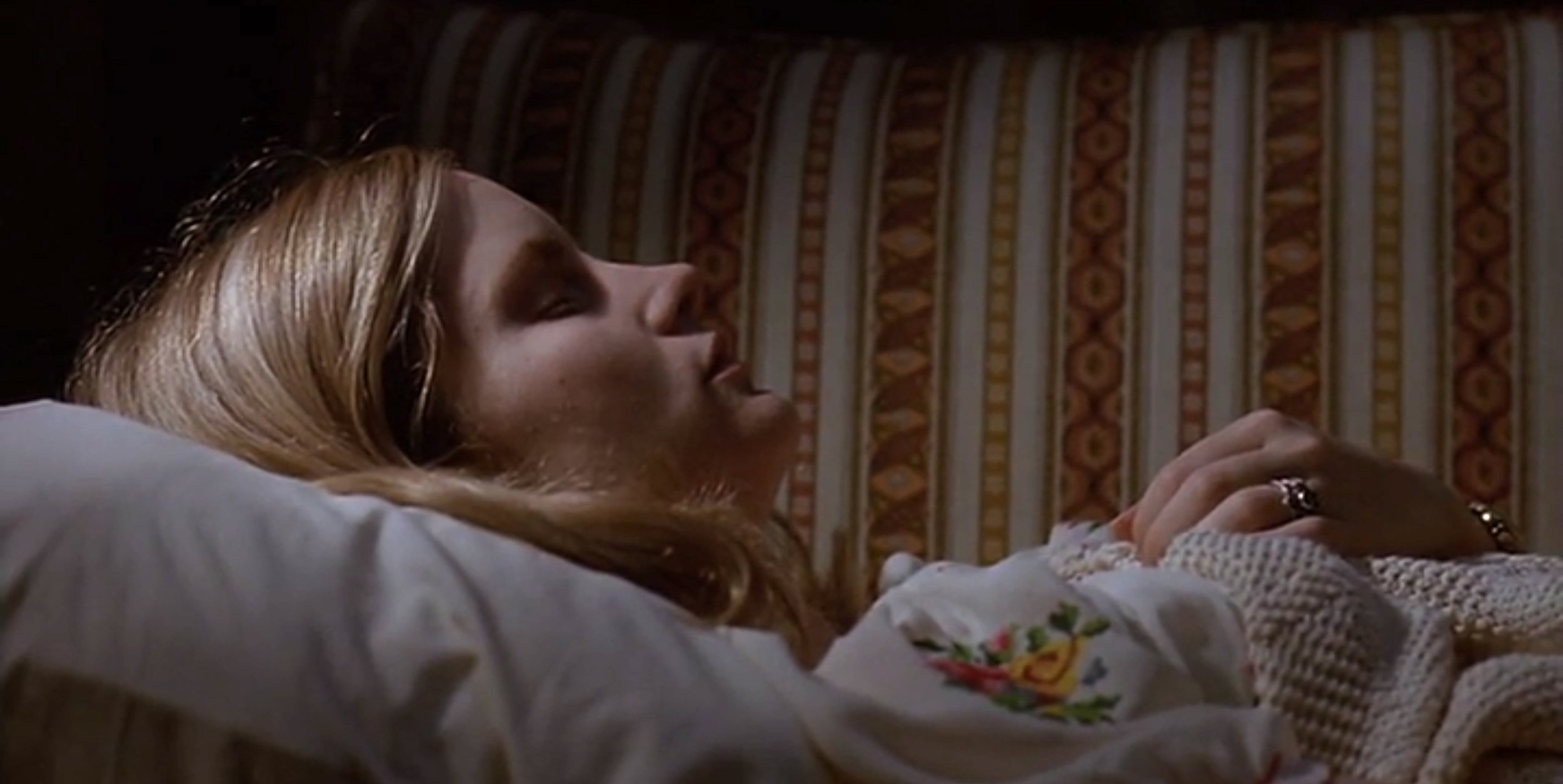 So why recommend this one? Two reasons. First of all, while his storytelling isn’t strong, Chapman does craft a compelling visual identity for the film. Two things stand out particularly; Leigh’s hideous clothes, including a selection of Hawaiian shirts that, against all odds, she makes look good, and, more importantly, the use of colour throughout the film. The walls of the main corridor in the apartment, and much of the detailing throughout, is painted in what you could call Cries and Whispers or Suspiria Red, depending on whether you want to lean towards the film’s pretensions to art or its sleazier side. It’s often mirrored by Leigh’s lipstick, and the effect is striking throughout, giving the film a graphical interest that is lacking in many of its other qualities.