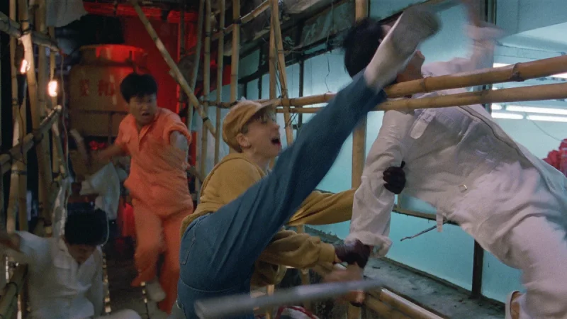 Of course, we’re not really here for nuanced portrayals of cross-cultural friendship, or even, if we’re honest here, for a coherent plot about money laundering. What Lady Reporter is about for most of its audience is a simple question: how creatively, and how awesomely, can Mang Hoi and Corey Yuen Kwai invent ways for Rothrock to kick the living shit out of everyone else in the movie? Happily, the answers are ‘very creatively’ and ‘escalatingly awesomely’. A relatively early highlight comes with an extended fight sequence on some bamboo scaffolding on the outside of a tall building. This looks genuinely perilous, and still allows Rothrock to show off some intricate moves. It’s also clear that Shang Chi owes this sequence a massive debt. Rothrock throwing down with Billy Chow was, she says, one of the most brutal fight sequences she ever shot, and the breathless speed and obvious full contact impacts of many of the blows bear that out.
