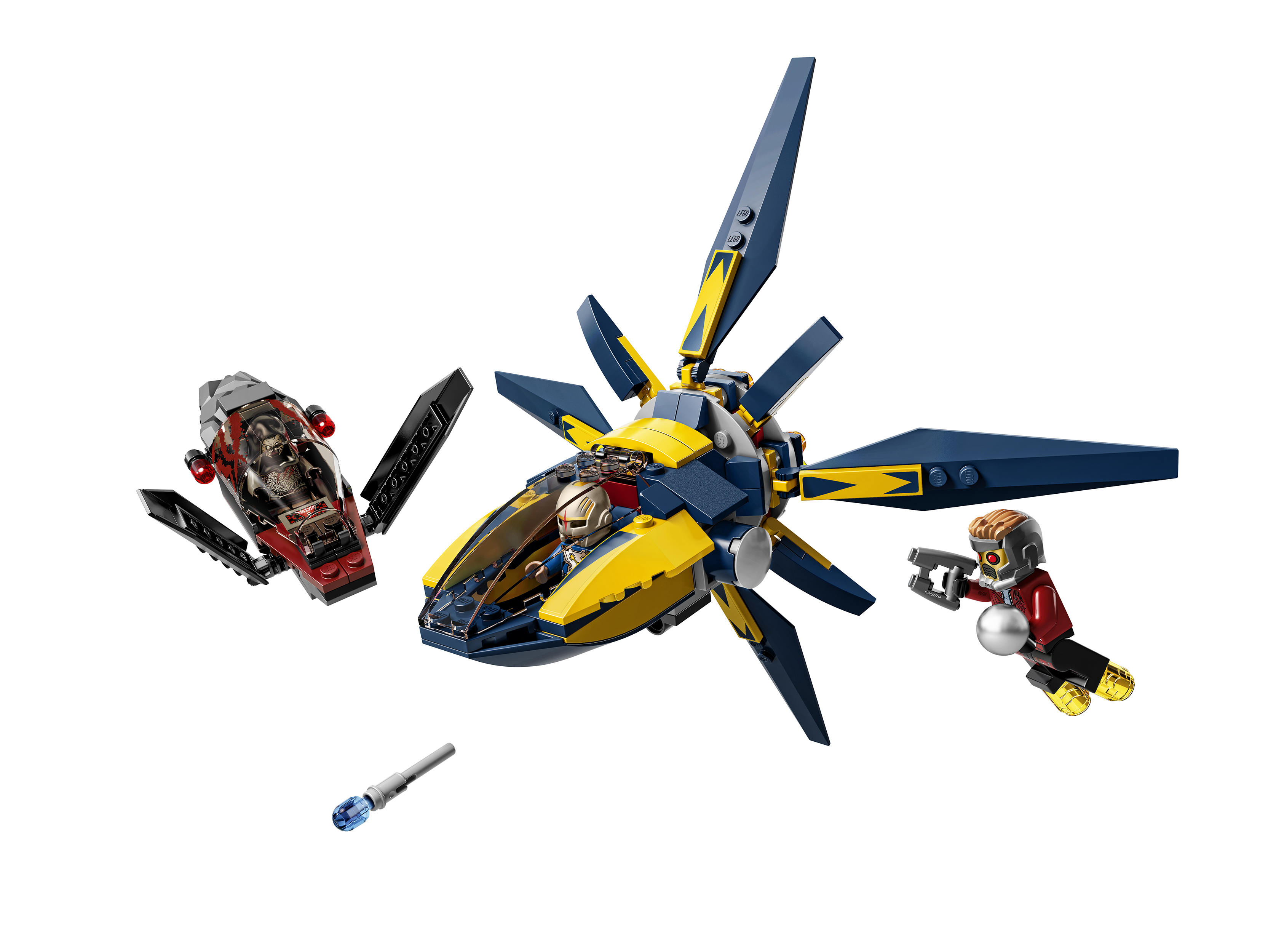 Launch into battle against the Sakaaran’s Necrocraft in the awesome Starblaster and help Star-Lord to escape with the orb! Place the Nova officer in the cockpit and launch into the sky. Fold back the wings for high-speed pursuit mode and then flip them up to activate arrest mode. Use the space blasters and boot thrusters of Star-Lord to outwit the enemy and protect the priceless orb! Includes 3 minifigures with assorted weapons and accessories: Star-Lord, the Sakaaran and a Nova officer.