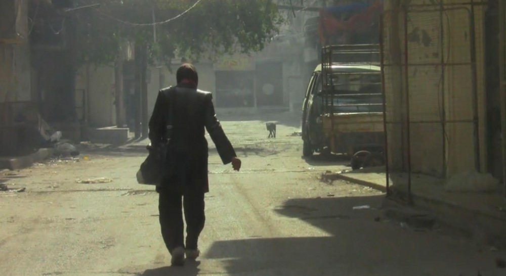 Even more critical than this though is are the food shortages. We hear residents discuss how they used to be allowed out to buy food, but now the blockade is in place even that isn’t possible. Hunger becomes endemic. In one of the saddest exchanges, after the food distribution point is shelled, we hear a resident say “they could drop both, barrel bombs and wheat, we’ll take it”. At a point where we’re seeing, and complaining about, some gaps on supermarket shelves in the UK, this is a real shot of perspective. The shelling and shortages throw up some crushingly sad imagery; skeletons lie in the street, a baby is visibly emaciated for lack of milk, an elderly couple picks through a pile of rubbish, sharing the scraps they find.