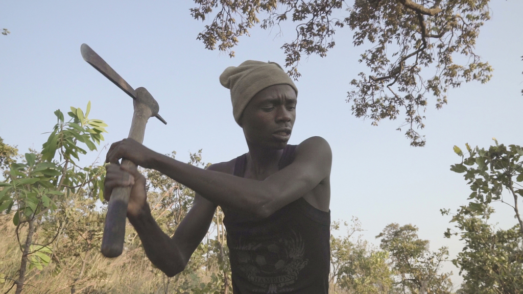 The film starts at dawn as we see our hero attempting to cut down an old robust tree using a small axe and nothing more. The camera lingers on the young man as he chops at the tree uninterrupted for what seems like an eternity. As the tree is finally cut down, Kabwita’s next challenge is to make a “bush oven” in which the charcoal is manufactured and then packed into big sacks for him to sell in the city. However the real adventure begins when our hero is seen loading sack after sack of precious coal onto a push-bike and wheeling it out onto the main road leading to the city.