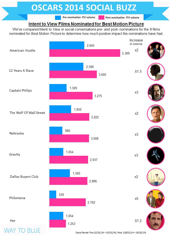 Here then, is their breakdown of each of the Best Picture Oscar contenders and the positive social turbulence they encountered following the announcements. Sad to see Spike Jonze’s Her not getting a similar bump to the rest of the group, but the buzz around Philomena following the nod plays well to the notion that even a nomination is enough to drive more people to the cinemas. Which is always a good thing.