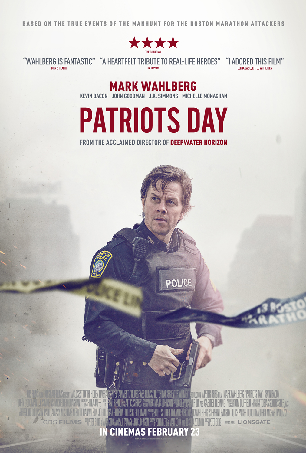 In the aftermath of an unspeakable act of terror, Police Sergeant TOMMY SAUNDERS (Mark Wahlberg) joins forces with courageous survivors, first responders and investigators in a race against the clock to hunt down the bombers before they strike again. Weaving together the stories of Special Agent RICHARD DESLAURIERS (Kevin Bacon), Police Commissioner ED DAVIS (John Goodman), Sergeant JEFFREY PUGLIESE (J.K. Simmons) and nurse CAROL SAUNDERS (Michelle Monaghan) this visceral and unflinching chronicle captures the intensity and edge-of-the-seat suspense that riveted the world.