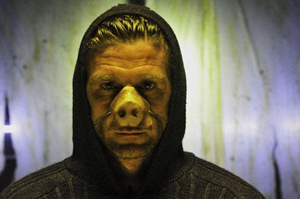 Indeed, Hawkes favours The Horseman (2008) style of implied brutality, letting the imagination run riot and using a whole number of bone-crunching, gut-squelching effects to suggest the horrific bodily damage being inflicted on the hostages. All the while we are party to Anderson as Piggy’s disturbing if over-acted presence as he toys with his prey wearing a pig snout. In this sense, there are no added surprises as we expect each member of the pub gang to meet their fate.