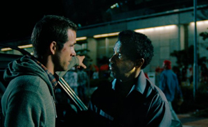Denzel Washington: So Ryan wasn’t driving the car. So we weren’t in control of where the car was moving. In this scene I’m handcuffed and I’m supposed to jump up and put the handcuffs over Ryan’s neck to choke him and bring him toward me. So we’re going fast and it just so happened I got whipped forward and he got whipped back, and our heads collided. The back of his head is harder than the front of my face. It actually happened twice.