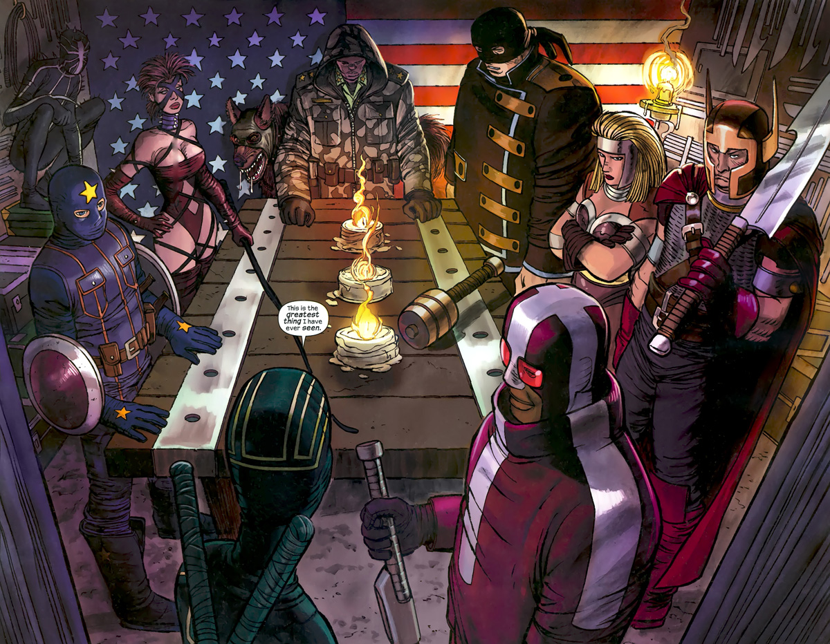 Here’s the new superhero team as they are revealed in the comic book, spoilers obviously if you want to go in cold. Gravity is the purple and white suited dude at the front. Click it if you want it big and in your face.
