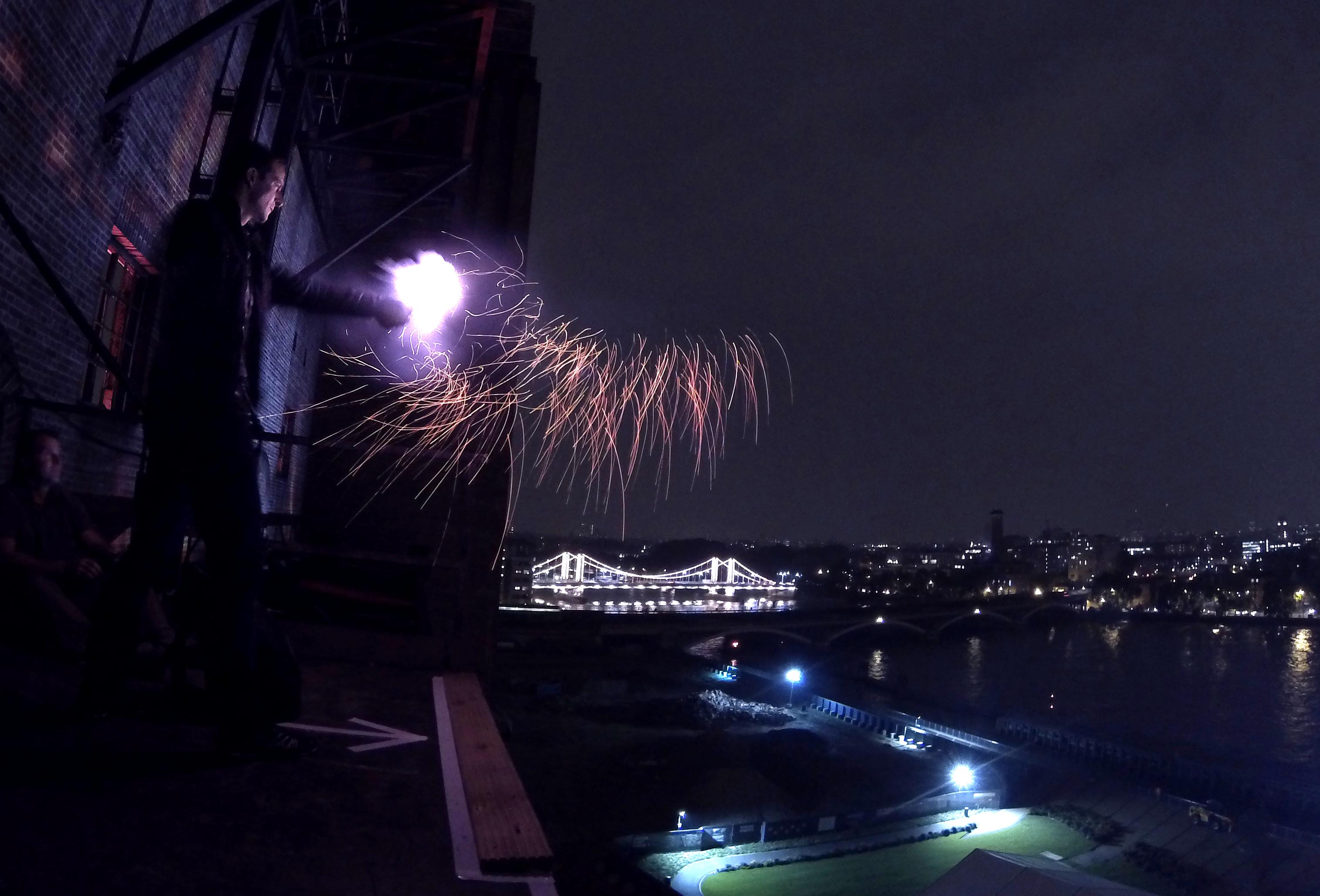 Fortunately, he didn’t take the advice, instead he chose to abseil. As he did, an animation began playing, projected directly on to the front of the power station. It started with a shaft of flame shooting up toward the chimneys, followed by images of the walls crumbling, and the ‘inside’ burning. To cap it off, fairly sizeable pyrotechnic charges went off, launching flame fifteen feet into the air and sending the noise of explosions echoing across South London.