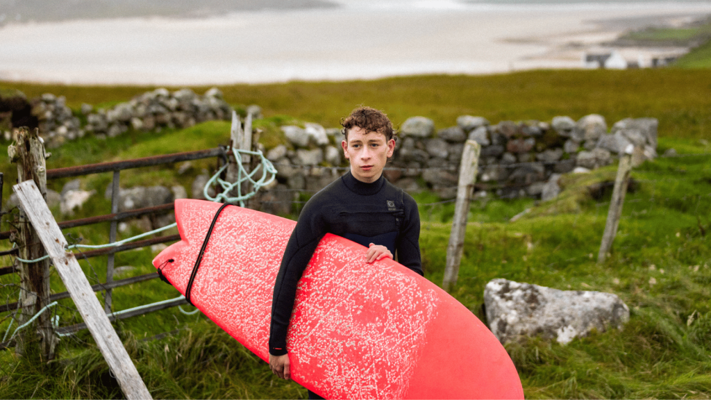 Set on Scotland’s rugged Western Isles the film follows Dondo (newcomer Lewis McCartney) a young surfer visibly still traumatised one year on from the disappearance of his father at sea. Dondo flirts with religion as a coping mechanism when the new Parish priest (Mark Lockyer) reopens the dilapidated local church. However, he finds much more age-appropriate comfort in his friendship with fellow student Sas (Ella Lily Hyland), the star pupil who’s curiosity about all things worldly and vulgar clashes with her parent’s expectations.