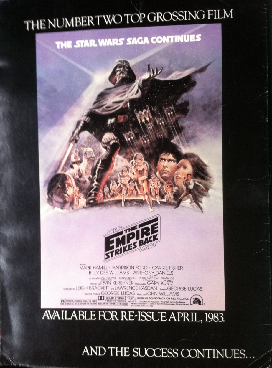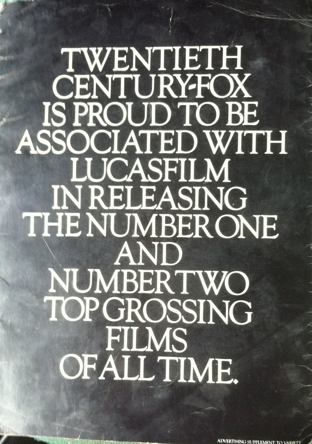 There is one item in our collection, and these are our photos of it, which remains takes pride of place in our collection of stuff. A very rare gatefold advert for Star Wars: Revenge of the Jedi from back in 1983. This was printed and sent out before the film was released, and before the name was changed to Return of the Jedi. It’s worth something now, and it’s exactly the sort of random piece of movie junk we’re pleased we held on to.