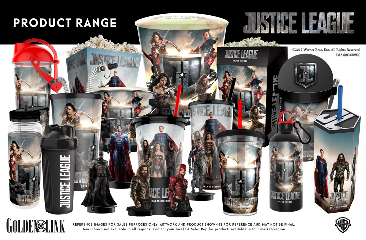 The promo for Justice League comes in the form of concession stand memorabilia from Goldenlink consisting of cups and popcorn boxes to figurines.