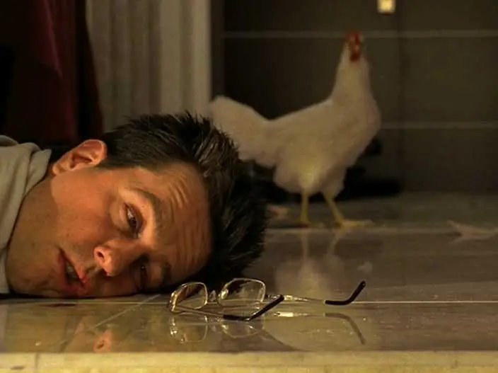 We see a chicken lolling around the room, a chair that’s smoking – Stu’s tooth is gone – and, even worse, so is their friend Doug – the one who’s supposed to be getting married. Oh, and we can’t forget Alan’s face when he realizes he’s been joined in the bathroom by a tiger.