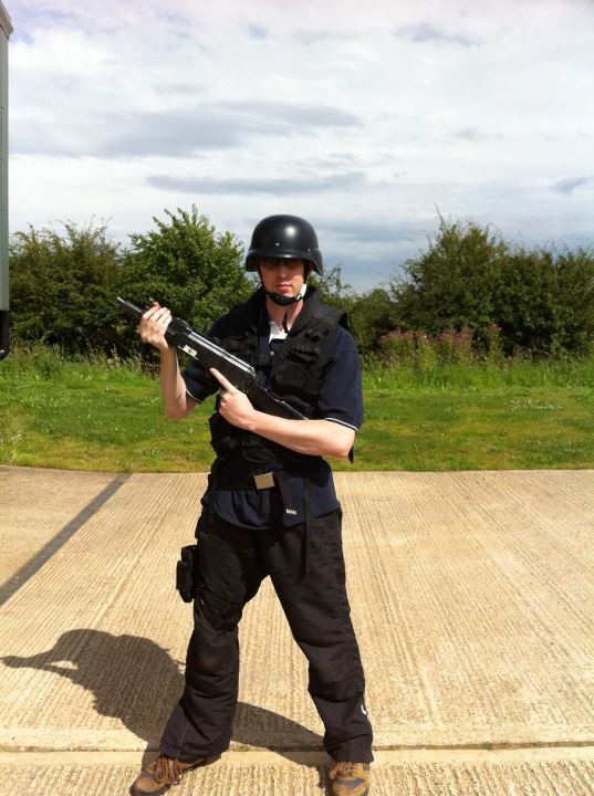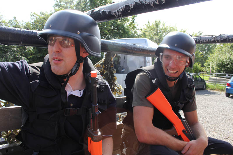 We all piled into the back of a Land Rover, kitted up with full body-armour, pistols and our trusty AK-47 (bright orange replicas!). Battle-cries were heard from miles around as we all got ready to go and save Nicola (there weren’t actually any battle-cries I’m afraid!). After releasing a flash-bang (which is flipping loud!) we stormed into the warehouse where we knew Nicola had been taken, took up positions and opened fire! The terrorists grabbed her and ran out of the back of the warehouse and we gave chase putting all we’d learnt into action (it was somewhat chaotic and none of us actually knew was the heck was going on but it was all very fun!). More