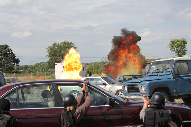 smoke grenades were lit, more flash-bangs deployed as we stormed out of the back of the warehouse still taking fire. We all took cover behind cars before there was an almighty explosion (it as absolutely amazing!) as a huge set of pyrotechnics exploded in front of us but we kept laying down fire to make sure that we saved Nicola!