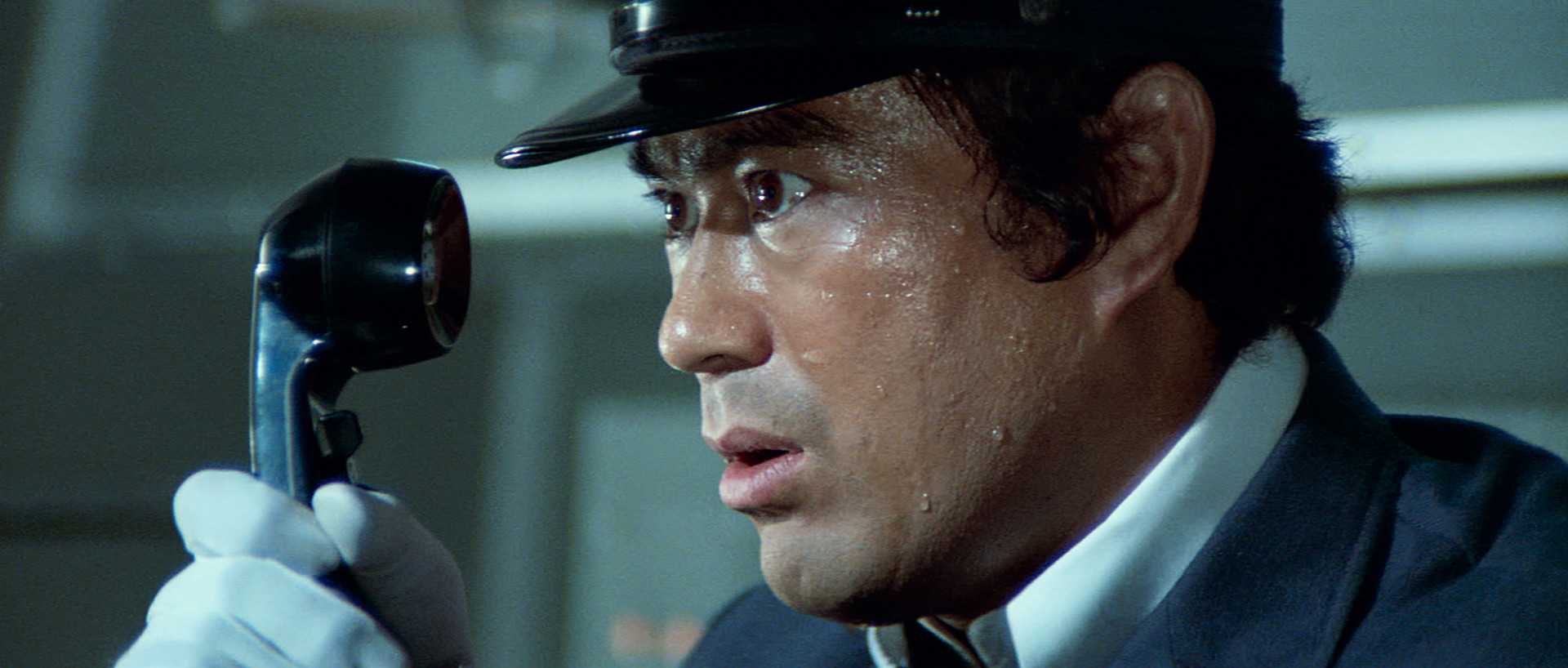 The first 45 minutes of the film are the most like that other movie. At that point, the film is, if you’ll excuse the expression, on rails. Director Junya Satō injects breakneck pace into the narrative as he builds the picture both on the train and around it as it builds up to the 80 KM/h mark that it then can’t go below without detonating the bomb. When we’re stuck in the cab of the train with driver Aoki (Shinichi ‘Sonny’ Chiba) there is a double effectiveness as the train hurtles forward, (often shown by some effective model shots, as well as real footage of trains) but the usually unstoppable force of Chiba, so active and lethal in films like The Streetfighter or The Executioner, is trapped behind the controls of the train, unable to do much other than control the speed. Chiba fans might also notice that there is a very small part (as a telephone operator) for Sister Streetfighter herself, Etsuko Shihomi.