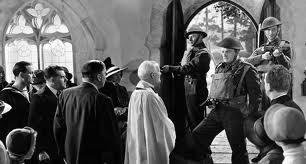 addressing the camera at the beginning and end of the film while standing next to a monument in the church graveyard which lists the names of the dead German paratroopers. Interestingly, at the time the film was released (7 December 1942 to be precise, a year to the day after the Japanese attack on Pearl Harbour), the planned German invasion of Britain, code named Operation Sea Lion, had largely receded as an actual threat. However, after the horror of the Blitz, a German invasion must have remained a terrifying possibility to many Britons, despite America’s entry into the war and the feeling that the tide had turned in Europe. One notable aspect of the film is the blunt brutality of its portrayal of violence; several years into the war and with many civilians having experienced first hand the terrible toll wrought by German bombing, it was likely thought that there was little point in gilding the lily about what would be required if people on the home front were forced to fight.