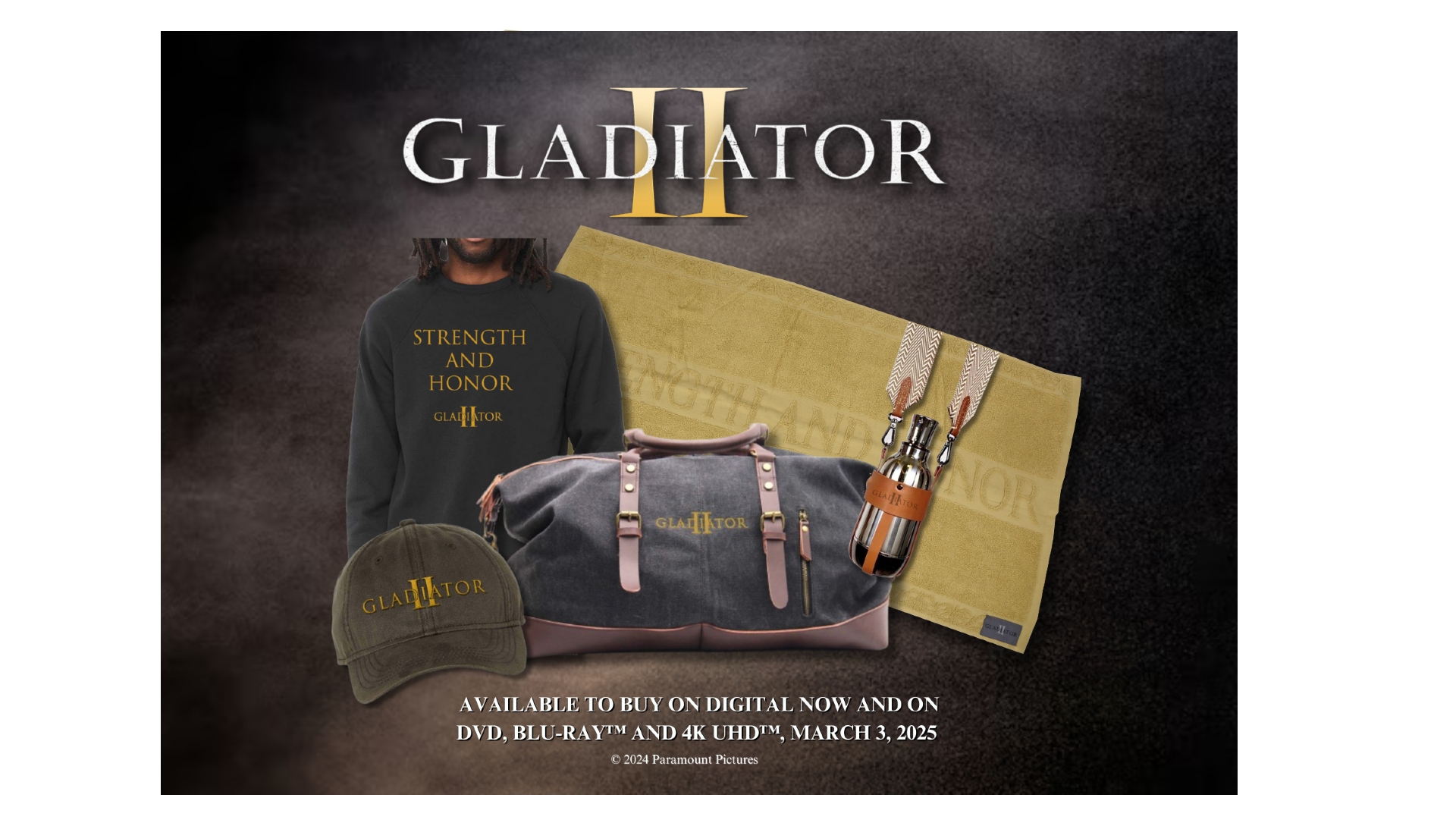 To celebrate the release of GLADIATOR II, available to buy on Digital now & on DVD, Blu-Ray, 4K UHD™, 4K UHD Steelbook® & 4K UHD HMV Exclusive Steelbook® March 3, 2025 – we are giving away a GLADIATOR II merch bundle containing: a 4K UHD copy of the film, branded luggage bag, travel water bottle with strap, jumper, beach towel and hat!