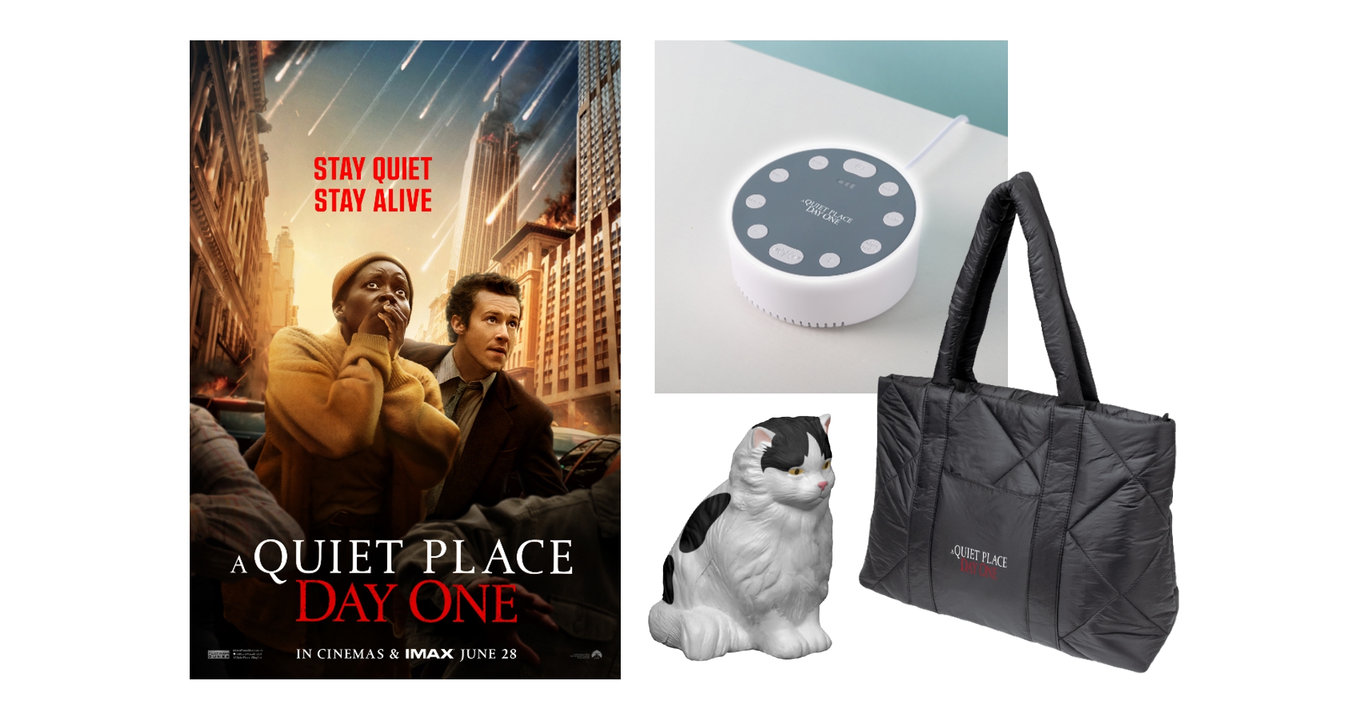 Included in the bundle is a special A QUIET PLACE: DAY ONE tote bag, Cat Stress reliever and a tranquil noise machine.