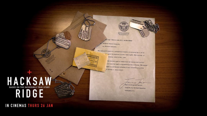 To mark the theatrical release of the upcoming critically acclaimed, Mel Gibson directed, Hacksaw Ridge we have a collection of official movie props to give away. Including the letter used by Tom Doss (Hugo Weaving) during Desmond’s (Andrew Garfield) court martial complete with envelope, as well as a selection of Dog Tags including Lerwin Glover, as played by Sam Worthington.