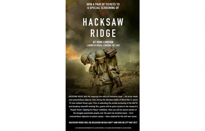 - The winner will receive a pair of tickets to attend the HACKSAW RIDGE screening at London’s Imperial War Museum, Lambeth Rd, London SE1 6HZ on the 18th May 2017 at [18:30pm]. Transportation to and from the Imperial War Museum is not included.