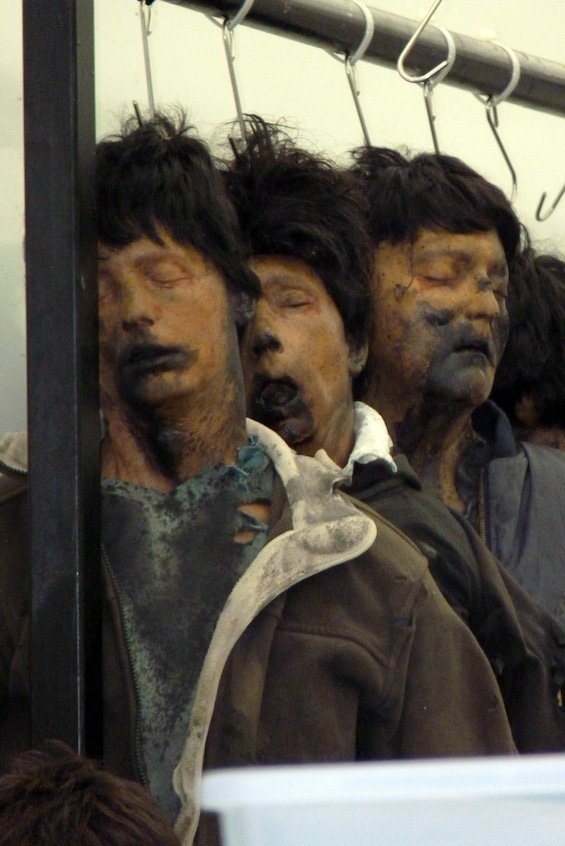 What we’re not seeing just yet are any zombies lumbering through the streets of Glasgow, which have been redressed to resemble the city of Philadelphia. Instead, what these latest pictures show are some prop dummies made up to look like rotting zombie carcasses. On this basis, the most obvious sign of the Solanum virus that causes the dead to rise in the film is a dark blue discolouration around the mouth. Not pretty, I think you’ll agree.